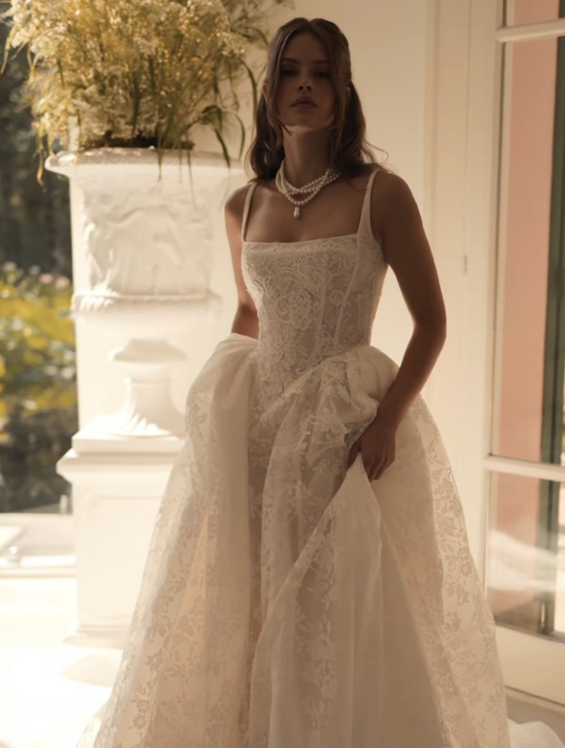 Matières nobles : soie, satin duchesse, mousseline, organza, dentelle de Calais. Privilégiez les tissus fluides et légers qui bougent gracieusement. La lourdeur des robes de princesse Disney jurera avec l’esthétique Bridgerton.