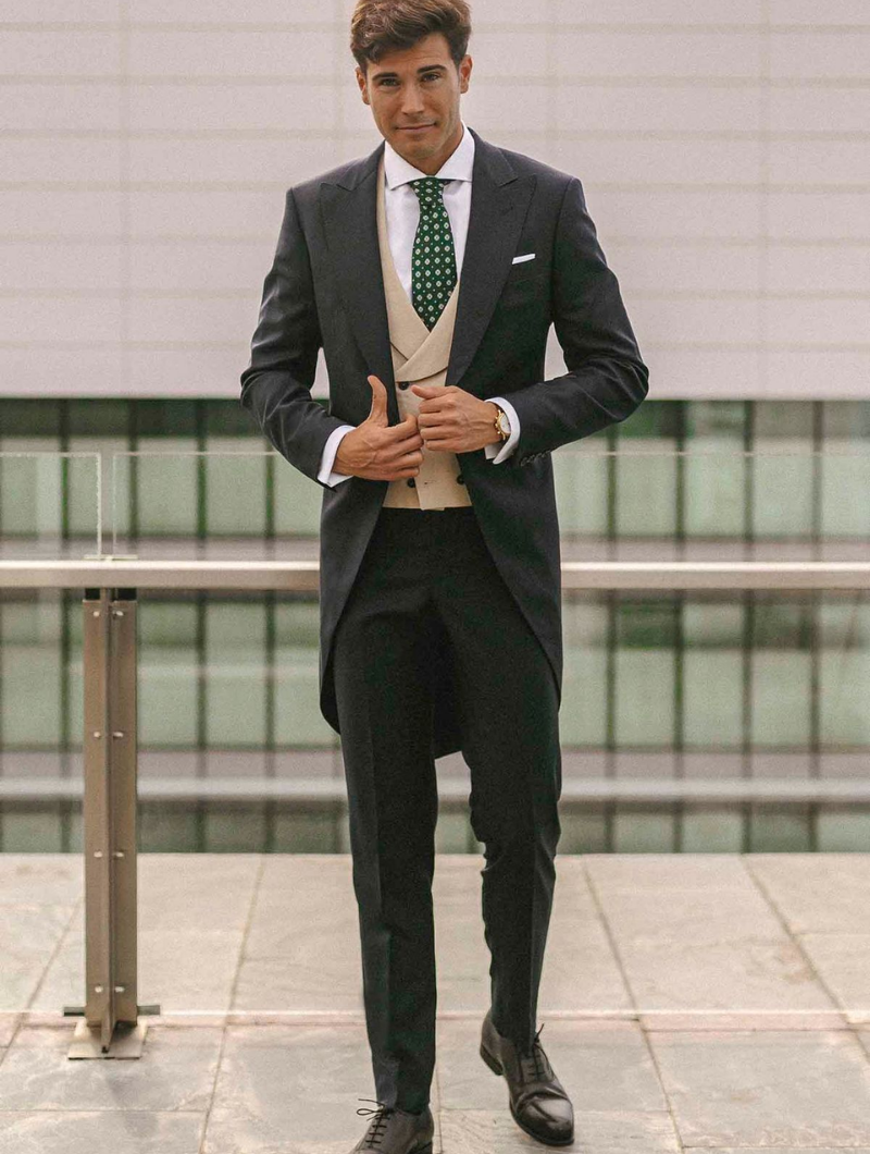 Pour les hommes : costumes clairs (beige, gris clair, bleu ciel) pour les mariages de jour, costumes sombres avec gilets fantaisie pour le soir, nœuds papillon encouragés, pochettes colorées. Ils peuvent oser le gilet brodé ou le trois-pièces vintage.