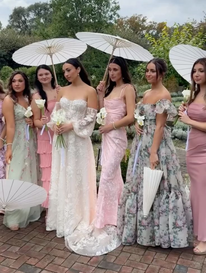 Pour les demoiselles d’honneur : robes Empire assorties dans le bleu Bridgerton, rose poudré, ou dégradé de pastels. Longueur cheville, tissus fluides, broderies délicates. Elles incarnent les sœurs Bridgerton et créent un impact visuel fort dans le cortège.